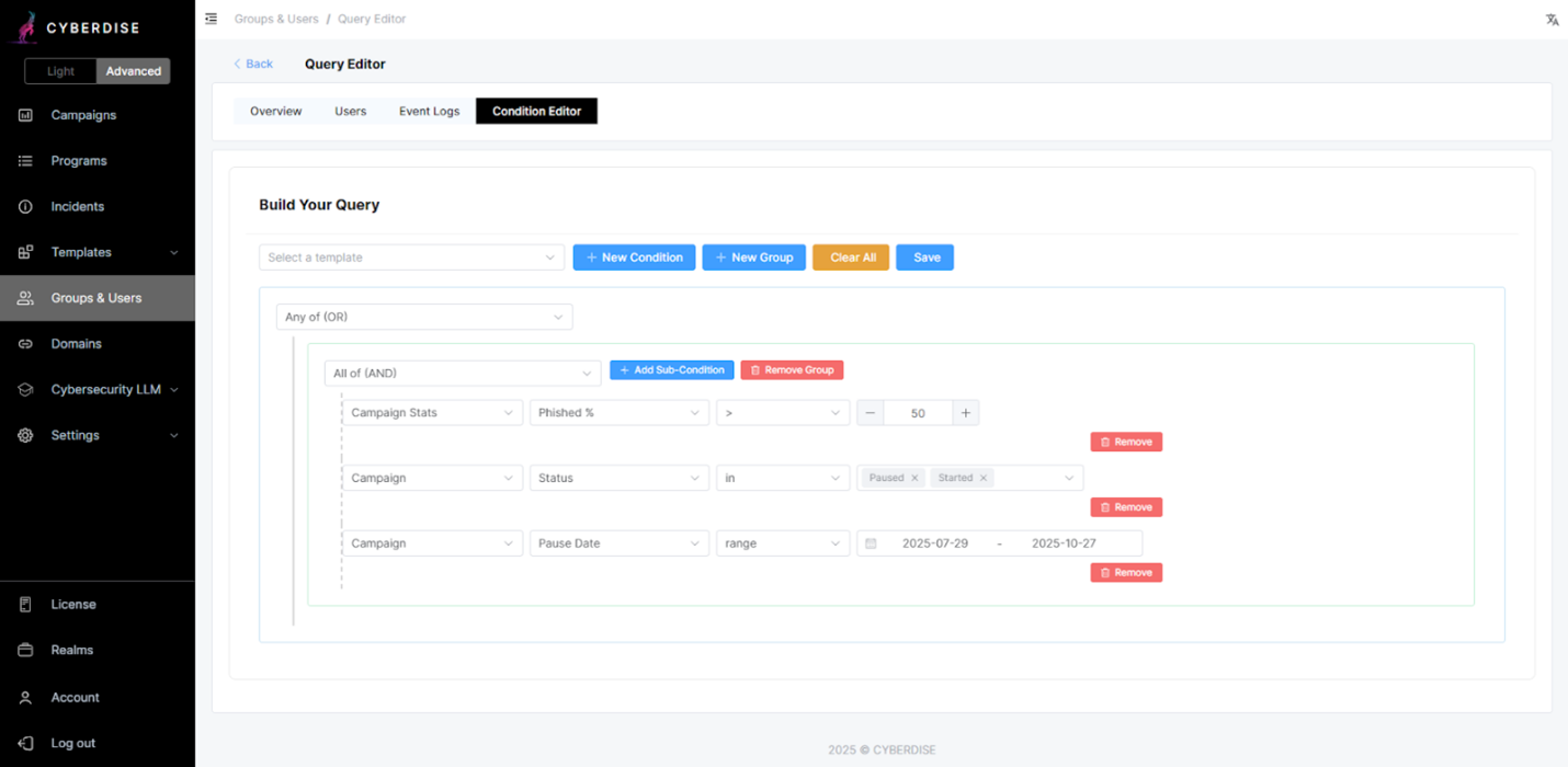 Operators can now automate group membership using conditional logic instead of manual assignment. These dynamic groups are built on existing base groups, with membership automatically recalculated whenever user data or group configurations change. A dedicated configuration page allows full control over rule definition, priority, and activation, ensuring real-time updates without logical conflicts.