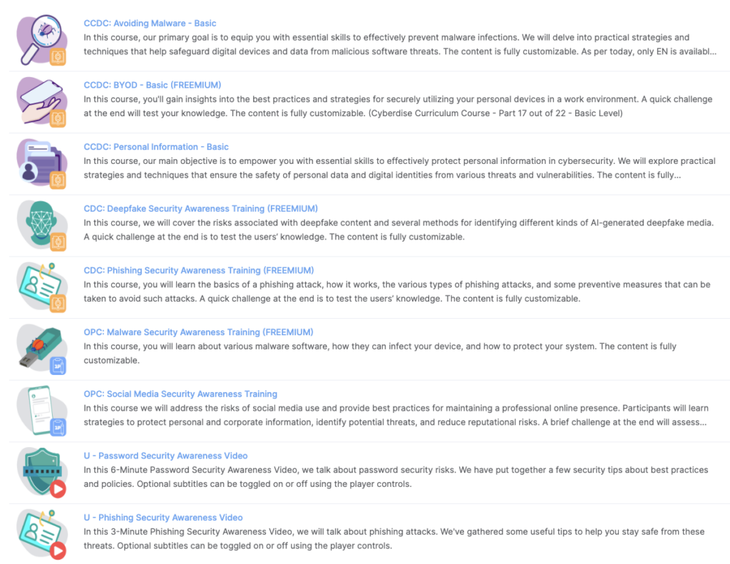 In our free phishing and training tool, the cybersecurity courses are stored as HTML eLearnings. All of these cybersecurity training modules can be customized to your needs using the course editor in CYBERDISE Freemium: