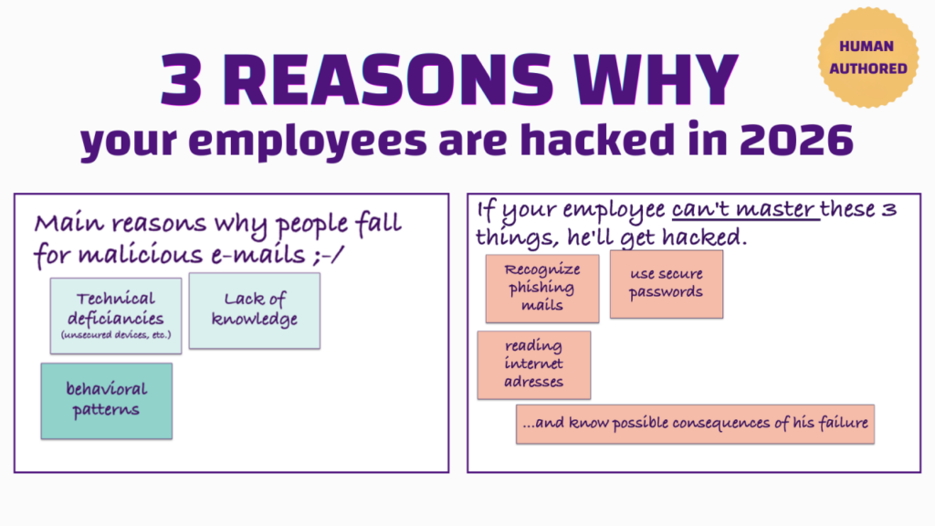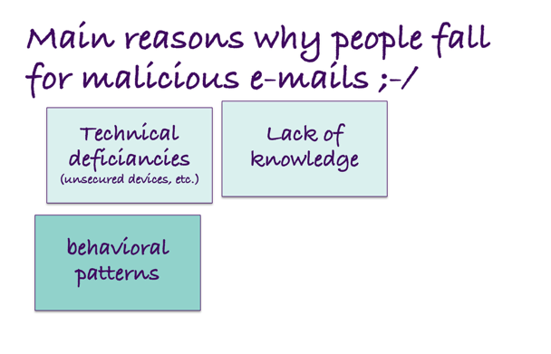 And that’s how it is today, it’s proven that at least 47% [1] of successful cyber-attacks start with a careless employee and mostly with an phishing email. Why does this happen, why do employees get caught up in it? Our experience shows that there are three main reasons why employees fall for malicious emails: