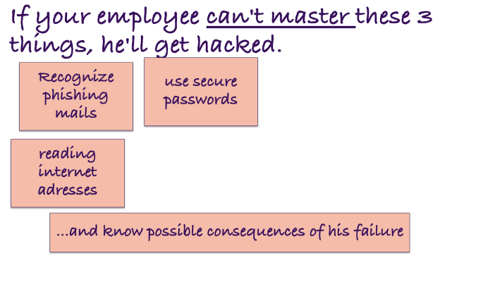 2. Focussed, short and repetitive training on IT security, cyber risks and the company’s security policies builds the appropriate knowledge in the employee. Trainings have to be adopted to the companies or to the users context.